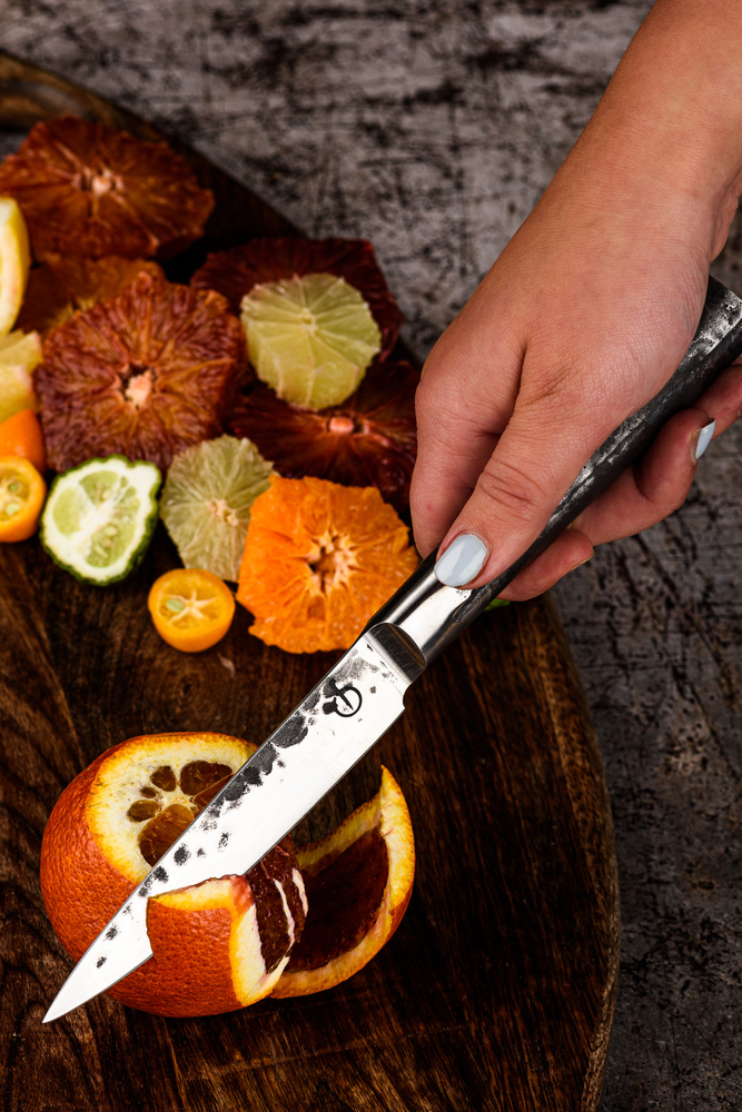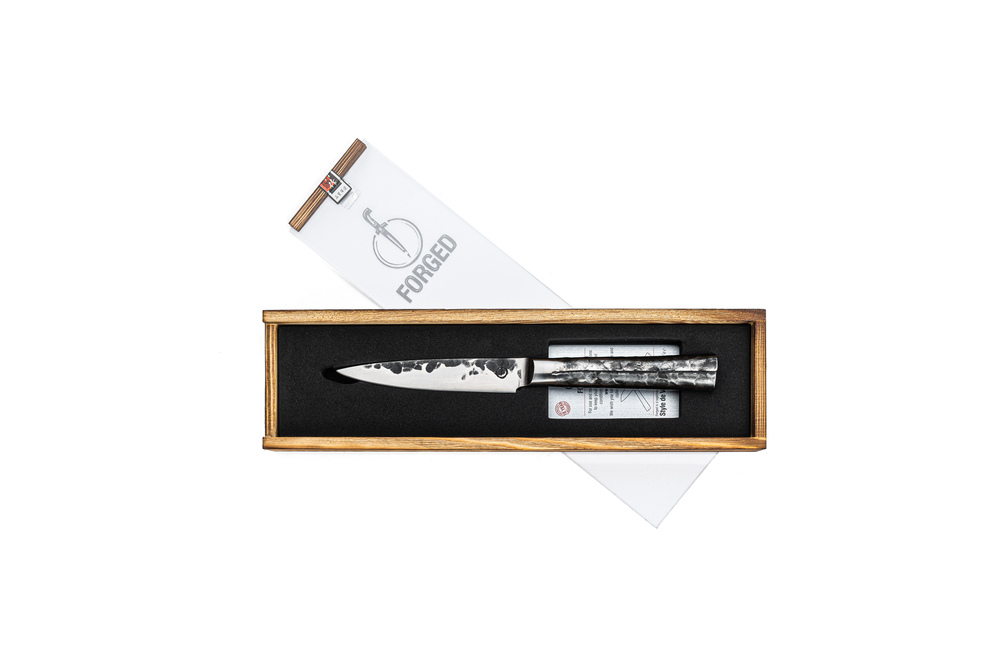 Het Forged Intense Universeel mes is de kleine variant van het koksmes. Ideaal om groenten of kleinere stukken vlees mee te snijden. Dankzij het smalle lemmet kun je er zeer nauwkeurig mee werken. De Forged Intense messen zijn vervaardigd van Japans 440C staal met een hardheid van 58 Rockwell. Alle Forged messen zijn met de hand gesmeed, hebben een lemmetdikte van 2 mm en een snijhoek van 18 graden. Verpakt in een luxe houten kistje. Met een garantie van 10 jaar.